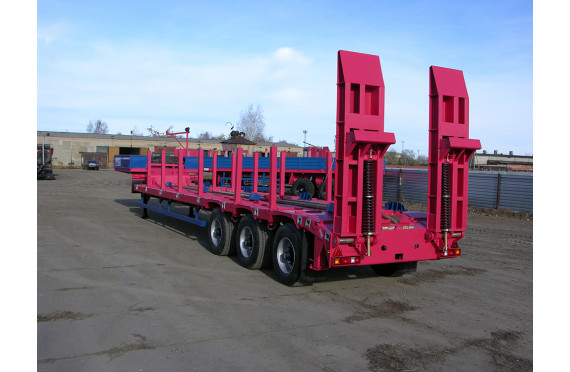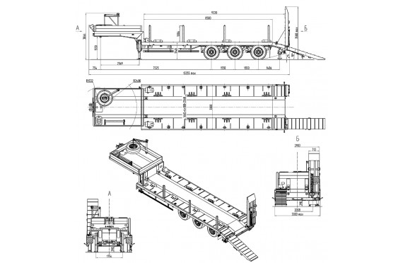 45200 кг, шины 395/85R20 или 445/65R22,5 / 6+1, платформа 12000 (12862 до трапов) x 2530 с уширителями до 3030 мм, ССУ 1550 мм, рессорная или пневматическая подвеска, съемные стойки, механические трапы с пружиной