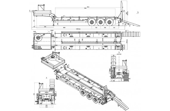 45000 кг, шины 445/65R22,5 или 395/85R20 / 6+1, платформа 10300 (11080 до трапов) x 2500 с уширителями до 3000 мм, приставные алюминиевые трапы, ССУ 1510 мм, рессорная подвеска, съемные стойки 1500 мм, съемные борта