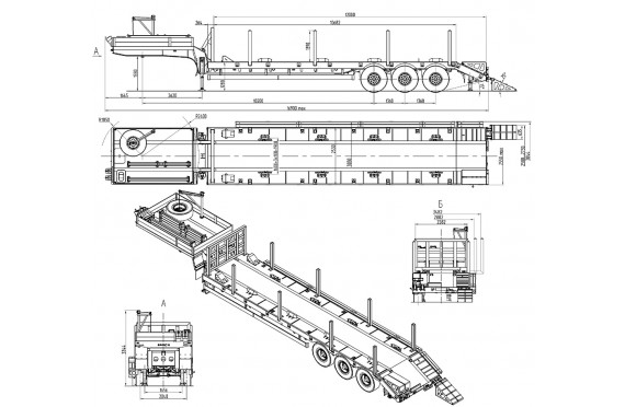45000 кг, шины 445/65R22,5 или 395/85R20 / 6+1, платформа 10300 (11080 до трапов) x 2500 с уширителями до 3000 мм, механические трапы, ССУ 1510 мм, рессорная подвеска, съемные стойки 1500 мм