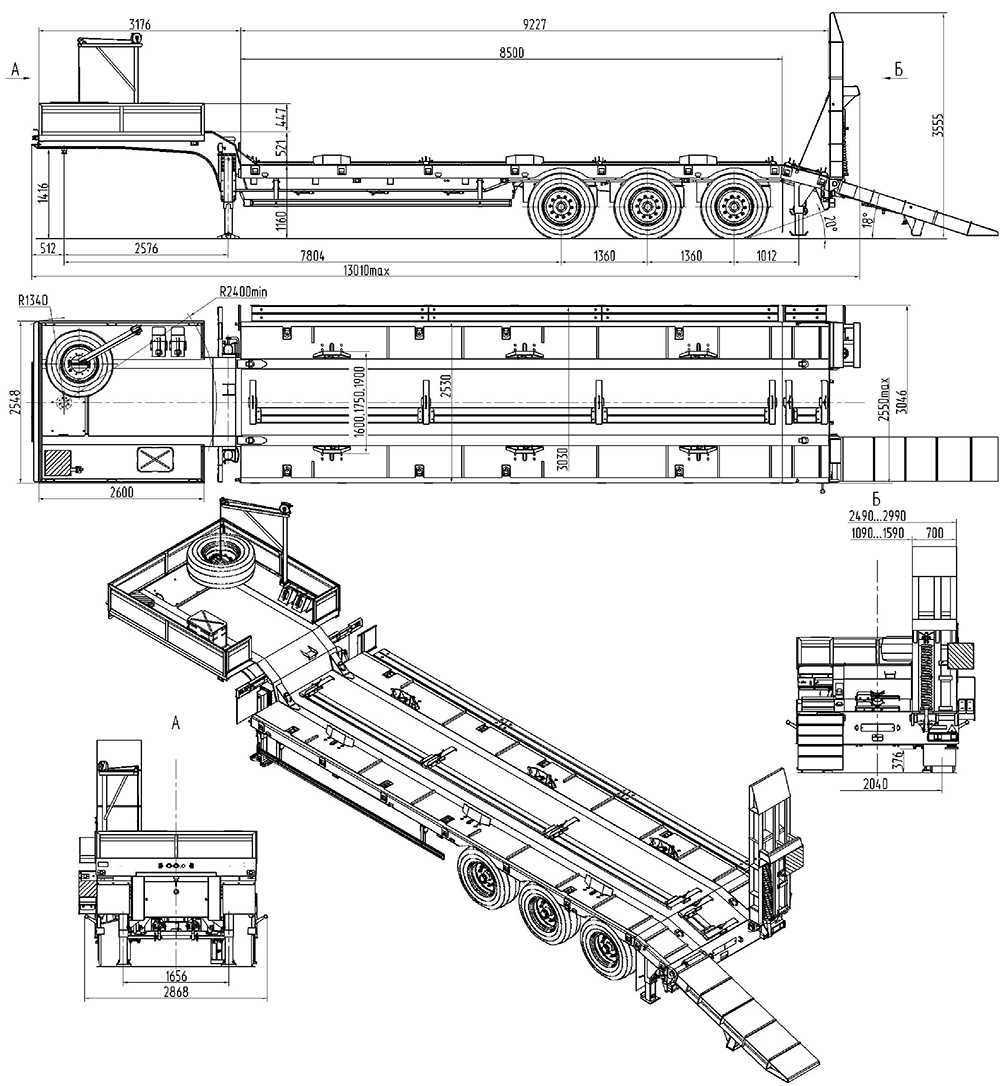 39000 кг, шины 385/65R22,5 или 445/65R22,5 / 6+1, платформа 11080 до трапов) x 2500 с уширителями до 3000 мм, ССУ 1510 мм, пневматическая или рессорная подвеска, съемные стойки 1500 мм, механические трапы