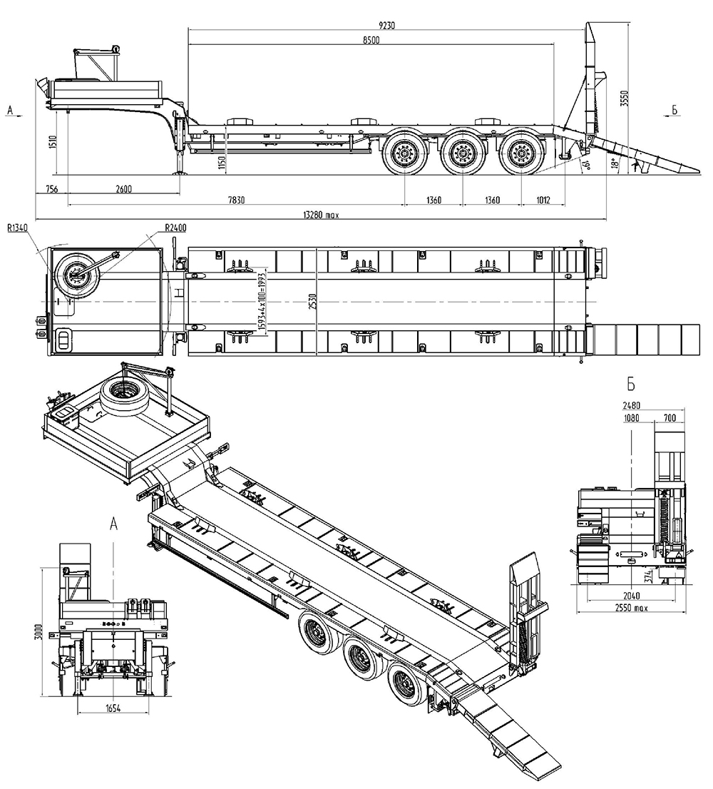 39000 кг, шины 385/65R22,5 или 445/65R22,5 / 6+1, платформа 11080 до трапов) x 2500 с уширителями до 3000 мм, ССУ 1510 мм, рессорная подвеска, съемные стойки 1500 мм, механические трапы
