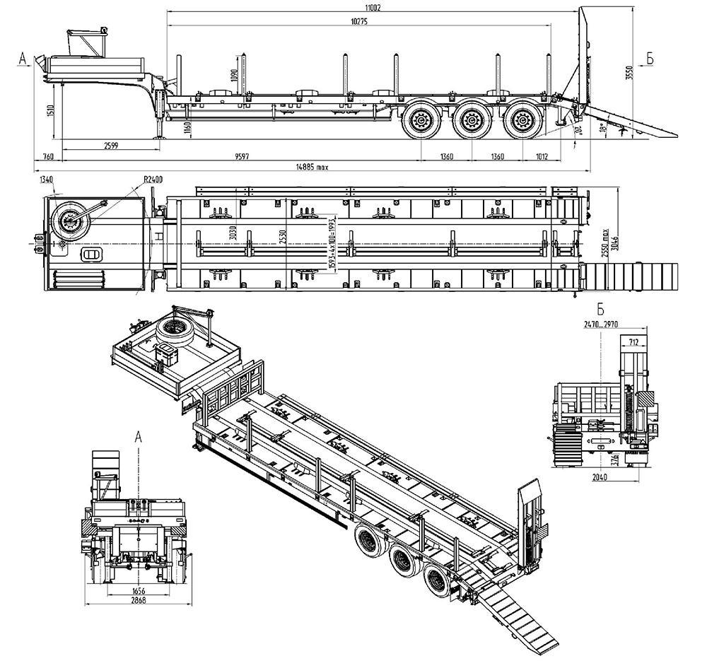 39000 кг, шины 385/65R22,5 или 445/65R22,5 / 6+1, платформа 11080 до трапов) x 2500 с уширителями до 3000 мм, ССУ 1510 мм, рессорная подвеска, съемные стойки 1500 мм, механические трапы