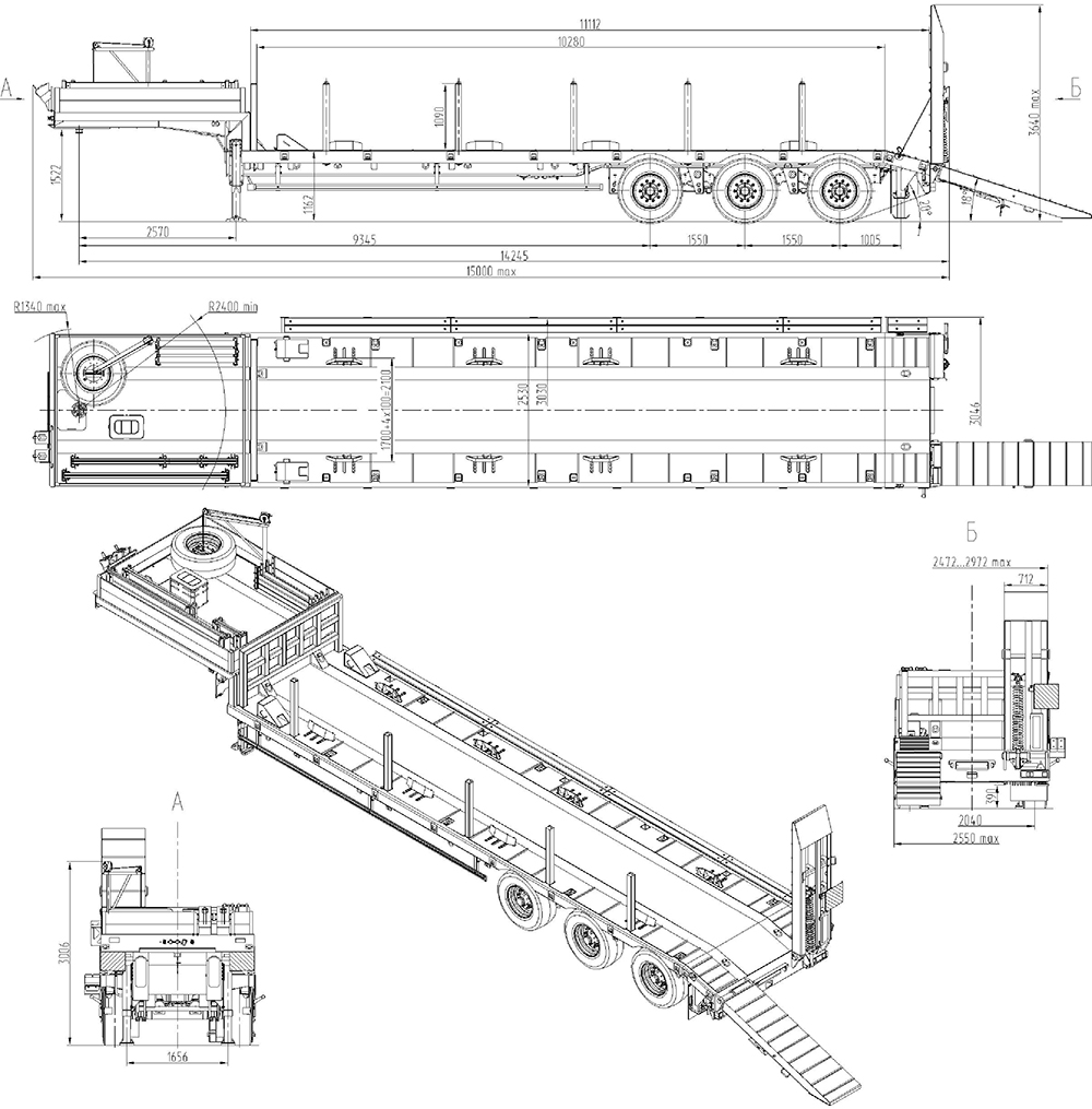 33500 кг, шины 385/65R22,5/6+1, платформа 8500 (9227 до трапов) x 2530 с уширителями до 3030 мм, ССУ 1510 мм, рессорная или пневматическая подвеска, съемные стойки
