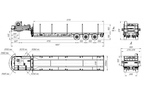 39000 кг, шины 385/65R22,5 или 445/65R22,5 / 6+1, платформа без трапов 12170 x 2500 мм, ССУ 1430 мм, рессорная подвеска, раздвижные коники 1500 мм