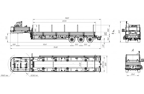 33500 кг, шины 385/65R22,5/6+1, платформа 8500 (9227 до трапов) x 2530 с уширителями до 3030 мм, ССУ 1510 мм, рессорная или пневматическая подвеска, съемные стойки