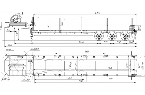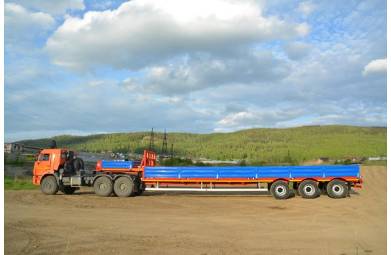 36000 кг, шины 385/65R22,5 / 6+1, платформа без трапов (12200 x 2500 мм, ССУ 1430 ммпневматическая подвеска, раздвижные коники 1500 мм, съемные борта или без них, в ГАБАРИТЕ по ДЛИНЕ АВТОПОЕЗДА с КАМАЗ 6x6